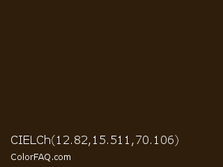 CIELCh 12.82,15.511,70.106 Color is a very dark orange color and the nearest color is Jacko Bean #2e1905. Hex code #2e1e0b and RGB value is rgb(46,30,11). In RGB color space, this color is composed of 18% red, 12% green, 4% blue, In CMYK color space, this color is composed of 0% cyan, 35% magenta, 76% yellow , 82% black , In HSL color space, this color has a hue angle of 33° , 61% saturation and 11% lightness.