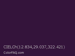 CIELCh 12.834,29.037,322.421 Color is a very dark purple color and the nearest color is Dark Purple #301934. Hex code #34143a and RGB value is rgb(52,20,58). In RGB color space, this color is composed of 20% red, 8% green, 23% blue, In CMYK color space, this color is composed of 10% cyan, 66% magenta, 0% yellow , 77% black , In HSL color space, this color has a hue angle of 291° , 49% saturation and 15% lightness.