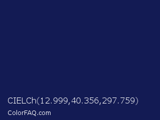 CIELCh 12.999,40.356,297.759 Color is a very dark blue color and the nearest color is Bunting #151f4c. Hex code #131b54 and RGB value is rgb(19,27,84). In RGB color space, this color is composed of 7% red, 11% green, 33% blue, In CMYK color space, this color is composed of 77% cyan, 68% magenta, 0% yellow , 67% black , In HSL color space, this color has a hue angle of 233° , 63% saturation and 20% lightness.