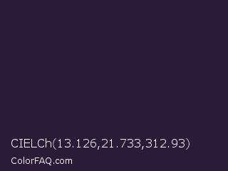 CIELCh 13.126,21.733,312.93 Color is a very dark purple color and the nearest color is Dark Purple #301934. Hex code #2b1b38 and RGB value is rgb(43,27,56). In RGB color space, this color is composed of 17% red, 11% green, 22% blue, In CMYK color space, this color is composed of 23% cyan, 52% magenta, 0% yellow , 78% black , In HSL color space, this color has a hue angle of 273° , 35% saturation and 16% lightness.