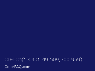 CIELCh 13.401,49.509,300.959 Color is a dark blue color and the nearest color is Lucky Point #1a1a68. Hex code #14185f and RGB value is rgb(20,24,95). In RGB color space, this color is composed of 8% red, 9% green, 37% blue, In CMYK color space, this color is composed of 79% cyan, 75% magenta, 0% yellow , 63% black , In HSL color space, this color has a hue angle of 237° , 65% saturation and 23% lightness.