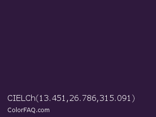 CIELCh 13.451,26.786,315.091 Color is a very dark purple color and the nearest color is Dark Purple #301934. Hex code #2f193d and RGB value is rgb(47,25,61). In RGB color space, this color is composed of 18% red, 10% green, 24% blue, In CMYK color space, this color is composed of 23% cyan, 59% magenta, 0% yellow , 76% black , In HSL color space, this color has a hue angle of 277° , 42% saturation and 17% lightness.