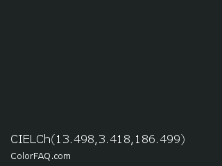 CIELCh 13.498,3.418,186.499 Color is a very dark cyan color and the nearest color is Dark Jungle Green #1a2421. Hex code #1d2423 and RGB value is rgb(29,36,35). In RGB color space, this color is composed of 11% red, 14% green, 14% blue, In CMYK color space, this color is composed of 19% cyan, 0% magenta, 3% yellow , 86% black , In HSL color space, this color has a hue angle of 171° , 11% saturation and 13% lightness.