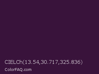 CIELCh 13.54,30.717,325.836 Color is a very dark magenta color and the nearest color is Valentino #350e42. Hex code #39133b and RGB value is rgb(57,19,59). In RGB color space, this color is composed of 22% red, 7% green, 23% blue, In CMYK color space, this color is composed of 3% cyan, 68% magenta, 0% yellow , 77% black , In HSL color space, this color has a hue angle of 297° , 51% saturation and 15% lightness.