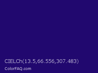 CIELCh 13.5,66.556,307.483 Color is a dark indigo color and the nearest color is Paris M #26056a. Hex code #21086f and RGB value is rgb(33,8,111). In RGB color space, this color is composed of 13% red, 3% green, 44% blue, In CMYK color space, this color is composed of 70% cyan, 93% magenta, 0% yellow , 56% black , In HSL color space, this color has a hue angle of 255° , 87% saturation and 23% lightness.