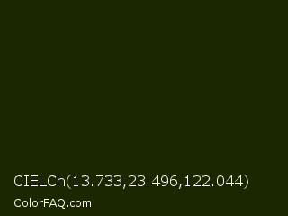 CIELCh 13.733,23.496,122.044 Color is a almost black lime color and the nearest color is Pine Tree #171f04. Hex code #1b2700 and RGB value is rgb(27,39,0). In RGB color space, this color is composed of 11% red, 15% green, 0% blue, In CMYK color space, this color is composed of 31% cyan, 0% magenta, 100% yellow , 85% black , In HSL color space, this color has a hue angle of 78° , 100% saturation and 8% lightness.