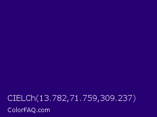 CIELCh 13.782,71.759,309.237 Color is a dark indigo color and the nearest color is Deep Blue #220878. Hex code #270074 and RGB value is rgb(39,0,116). In RGB color space, this color is composed of 15% red, 0% green, 45% blue, In CMYK color space, this color is composed of 66% cyan, 100% magenta, 0% yellow , 55% black , In HSL color space, this color has a hue angle of 260° , 100% saturation and 23% lightness.