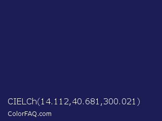 CIELCh 14.112,40.681,300.021 Color is a very dark blue color and the nearest color is Port Gore #251f4f. Hex code #1c1c56 and RGB value is rgb(28,28,86). In RGB color space, this color is composed of 11% red, 11% green, 34% blue, In CMYK color space, this color is composed of 67% cyan, 67% magenta, 0% yellow , 66% black , In HSL color space, this color has a hue angle of 240° , 51% saturation and 22% lightness.