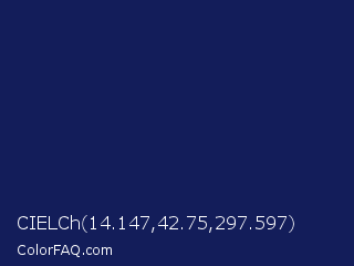 CIELCh 14.147,42.75,297.597 Color is a very dark blue color and the nearest color is Downriver #092256. Hex code #131d5a and RGB value is rgb(19,29,90). In RGB color space, this color is composed of 7% red, 11% green, 35% blue, In CMYK color space, this color is composed of 79% cyan, 68% magenta, 0% yellow , 65% black , In HSL color space, this color has a hue angle of 232° , 65% saturation and 21% lightness.
