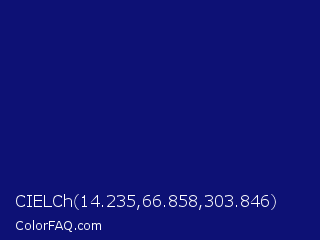 CIELCh 14.235,66.858,303.846 Color is a dark blue color and the nearest color is Arapawa #110c6c. Hex code #0d1175 and RGB value is rgb(13,17,117). In RGB color space, this color is composed of 5% red, 7% green, 46% blue, In CMYK color space, this color is composed of 89% cyan, 85% magenta, 0% yellow , 54% black , In HSL color space, this color has a hue angle of 238° , 80% saturation and 25% lightness.