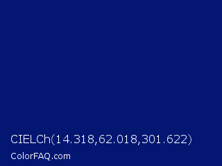 CIELCh 14.318,62.018,301.622 Color is a dark blue color and the nearest color is Dark Imperial Blue #00147e. Hex code #031671 and RGB value is rgb(3,22,113). In RGB color space, this color is composed of 1% red, 9% green, 44% blue, In CMYK color space, this color is composed of 97% cyan, 81% magenta, 0% yellow , 56% black , In HSL color space, this color has a hue angle of 230° , 95% saturation and 23% lightness.