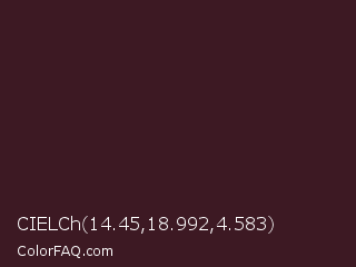 CIELCh 14.45,18.992,4.583 Color is a very dark rose color and the nearest color is Jon #3b1f1f. Hex code #3d1923 and RGB value is rgb(61,25,35). In RGB color space, this color is composed of 24% red, 10% green, 14% blue, In CMYK color space, this color is composed of 0% cyan, 59% magenta, 43% yellow , 76% black , In HSL color space, this color has a hue angle of 343° , 42% saturation and 17% lightness.