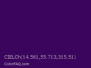 CIELCh 14.561,55.713,315.51 Color is a very dark purple color and the nearest color is Ripe Plum #410056. Hex code #3b055d and RGB value is rgb(59,5,93). In RGB color space, this color is composed of 23% red, 2% green, 36% blue, In CMYK color space, this color is composed of 37% cyan, 95% magenta, 0% yellow , 64% black , In HSL color space, this color has a hue angle of 277° , 90% saturation and 19% lightness.
