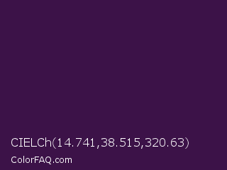 CIELCh 14.741,38.515,320.63 Color is a very dark purple color and the nearest color is Valentino #350e42. Hex code #3c1248 and RGB value is rgb(60,18,72). In RGB color space, this color is composed of 24% red, 7% green, 28% blue, In CMYK color space, this color is composed of 17% cyan, 75% magenta, 0% yellow , 72% black , In HSL color space, this color has a hue angle of 287° , 60% saturation and 18% lightness.