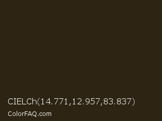 CIELCh 14.771,12.957,83.837 Color is a very dark orange color and the nearest color is Mikado #2d2510. Hex code #2d2413 and RGB value is rgb(45,36,19). In RGB color space, this color is composed of 18% red, 14% green, 7% blue, In CMYK color space, this color is composed of 0% cyan, 20% magenta, 58% yellow , 82% black , In HSL color space, this color has a hue angle of 39° , 41% saturation and 13% lightness.