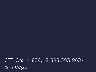 CIELCh 14.839,18.393,293.863 Color is a very dark blue color and the nearest color is Ebony Clay #26283b. Hex code #22233d and RGB value is rgb(34,35,61). In RGB color space, this color is composed of 13% red, 14% green, 24% blue, In CMYK color space, this color is composed of 44% cyan, 43% magenta, 0% yellow , 76% black , In HSL color space, this color has a hue angle of 238° , 28% saturation and 19% lightness.