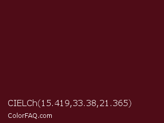 CIELCh 15.419,33.38,21.365 Color is a very dark red color and the nearest color is Maroon Oak #520c17. Hex code #4f0c17 and RGB value is rgb(79,12,23). In RGB color space, this color is composed of 31% red, 5% green, 9% blue, In CMYK color space, this color is composed of 0% cyan, 85% magenta, 71% yellow , 69% black , In HSL color space, this color has a hue angle of 350° , 74% saturation and 18% lightness.