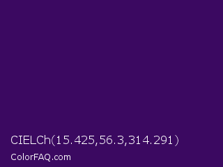 CIELCh 15.425,56.3,314.291 Color is a very dark purple color and the nearest color is Jagger #350e57. Hex code #3b0961 and RGB value is rgb(59,9,97). In RGB color space, this color is composed of 23% red, 4% green, 38% blue, In CMYK color space, this color is composed of 39% cyan, 91% magenta, 0% yellow , 62% black , In HSL color space, this color has a hue angle of 274° , 83% saturation and 21% lightness.