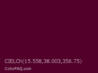 CIELCh 15.558,38.003,356.75 Color is a very dark rose color and the nearest color is Blackberry #4d0135. Hex code #53002b and RGB value is rgb(83,0,43). In RGB color space, this color is composed of 33% red, 0% green, 17% blue, In CMYK color space, this color is composed of 0% cyan, 100% magenta, 48% yellow , 67% black , In HSL color space, this color has a hue angle of 329° , 100% saturation and 16% lightness.