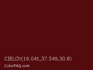 CIELCh 16.041,37.549,30.8 Color is a very dark red color and the nearest color is Heath #541012. Hex code #530b0d and RGB value is rgb(83,11,13). In RGB color space, this color is composed of 33% red, 4% green, 5% blue, In CMYK color space, this color is composed of 0% cyan, 87% magenta, 84% yellow , 67% black , In HSL color space, this color has a hue angle of 358° , 77% saturation and 18% lightness.