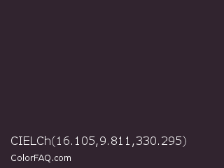 CIELCh 16.105,9.811,330.295 Color is a very dark magenta color and the nearest color is Thunder #33292f. Hex code #31242f and RGB value is rgb(49,36,47). In RGB color space, this color is composed of 19% red, 14% green, 18% blue, In CMYK color space, this color is composed of 0% cyan, 27% magenta, 4% yellow , 81% black , In HSL color space, this color has a hue angle of 309° , 15% saturation and 17% lightness.