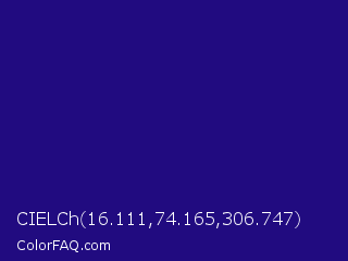 CIELCh 16.111,74.165,306.747 Color is a dark indigo color and the nearest color is Deep Blue #220878. Hex code #210b80 and RGB value is rgb(33,11,128). In RGB color space, this color is composed of 13% red, 4% green, 50% blue, In CMYK color space, this color is composed of 74% cyan, 91% magenta, 0% yellow , 50% black , In HSL color space, this color has a hue angle of 251° , 84% saturation and 27% lightness.