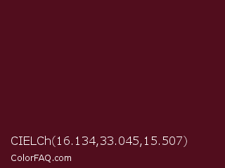 CIELCh 16.134,33.045,15.507 Color is a very dark red color and the nearest color is Maroon Oak #520c17. Hex code #510d1d and RGB value is rgb(81,13,29). In RGB color space, this color is composed of 32% red, 5% green, 11% blue, In CMYK color space, this color is composed of 0% cyan, 84% magenta, 64% yellow , 68% black , In HSL color space, this color has a hue angle of 346° , 72% saturation and 18% lightness.