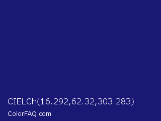 CIELCh 16.292,62.32,303.283 Color is a dark indigo color and the nearest color is Midnight Blue #191970. Hex code #1a1875 and RGB value is rgb(26,24,117). In RGB color space, this color is composed of 10% red, 9% green, 46% blue, In CMYK color space, this color is composed of 78% cyan, 79% magenta, 0% yellow , 54% black , In HSL color space, this color has a hue angle of 241° , 66% saturation and 28% lightness.