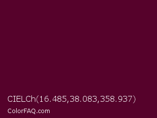 CIELCh 16.485,38.083,358.937 Color is a very dark rose color and the nearest color is Bordeaux #5c0120. Hex code #56022b and RGB value is rgb(86,2,43). In RGB color space, this color is composed of 34% red, 1% green, 17% blue, In CMYK color space, this color is composed of 0% cyan, 98% magenta, 50% yellow , 66% black , In HSL color space, this color has a hue angle of 331° , 95% saturation and 17% lightness.