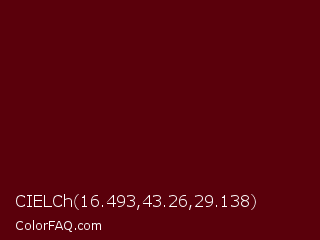 CIELCh 16.493,43.26,29.138 Color is a very dark red color and the nearest color is Rosewood #65000b. Hex code #5a000b and RGB value is rgb(90,0,11). In RGB color space, this color is composed of 35% red, 0% green, 4% blue, In CMYK color space, this color is composed of 0% cyan, 100% magenta, 88% yellow , 65% black , In HSL color space, this color has a hue angle of 353° , 100% saturation and 18% lightness.