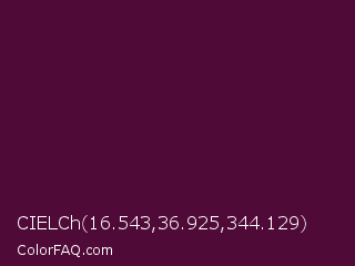 CIELCh 16.543,36.925,344.129 Color is a very dark magenta color and the nearest color is Blackberry #4d0135. Hex code #500a38 and RGB value is rgb(80,10,56). In RGB color space, this color is composed of 31% red, 4% green, 22% blue, In CMYK color space, this color is composed of 0% cyan, 88% magenta, 30% yellow , 69% black , In HSL color space, this color has a hue angle of 321° , 78% saturation and 18% lightness.