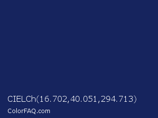 CIELCh 16.702,40.051,294.713 Color is a dark blue color and the nearest color is Madison #09255d. Hex code #16245e and RGB value is rgb(22,36,94). In RGB color space, this color is composed of 9% red, 14% green, 37% blue, In CMYK color space, this color is composed of 77% cyan, 62% magenta, 0% yellow , 63% black , In HSL color space, this color has a hue angle of 228° , 62% saturation and 23% lightness.