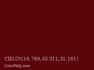 CIELCh 16.789,43.011,31.161 Color is a very dark red color and the nearest color is Rosewood #65000b. Hex code #5a0309 and RGB value is rgb(90,3,9). In RGB color space, this color is composed of 35% red, 1% green, 4% blue, In CMYK color space, this color is composed of 0% cyan, 97% magenta, 90% yellow , 65% black , In HSL color space, this color has a hue angle of 356° , 94% saturation and 18% lightness.