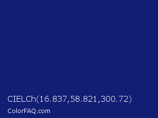 CIELCh 16.837,58.821,300.72 Color is a dark blue color and the nearest color is Midnight Blue #191970. Hex code #121d74 and RGB value is rgb(18,29,116). In RGB color space, this color is composed of 7% red, 11% green, 45% blue, In CMYK color space, this color is composed of 84% cyan, 75% magenta, 0% yellow , 55% black , In HSL color space, this color has a hue angle of 233° , 73% saturation and 26% lightness.