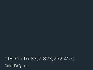 CIELCh 16.83,7.823,252.457 Color is a very dark blue color and the nearest color is Charleston Green #232b2b. Hex code #1f2b34 and RGB value is rgb(31,43,52). In RGB color space, this color is composed of 12% red, 17% green, 20% blue, In CMYK color space, this color is composed of 40% cyan, 17% magenta, 0% yellow , 80% black , In HSL color space, this color has a hue angle of 206° , 25% saturation and 16% lightness.