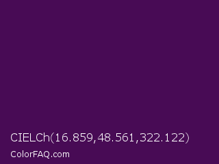 CIELCh 16.859,48.561,322.122 Color is a very dark purple color and the nearest color is Clairvoyant #480656. Hex code #480b55 and RGB value is rgb(72,11,85). In RGB color space, this color is composed of 28% red, 4% green, 33% blue, In CMYK color space, this color is composed of 15% cyan, 87% magenta, 0% yellow , 67% black , In HSL color space, this color has a hue angle of 289° , 77% saturation and 19% lightness.
