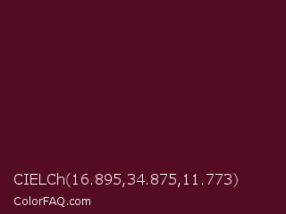 CIELCh 16.895,34.875,11.773 Color is a very dark rose color and the nearest color is Maroon Oak #520c17. Hex code #550b21 and RGB value is rgb(85,11,33). In RGB color space, this color is composed of 33% red, 4% green, 13% blue, In CMYK color space, this color is composed of 0% cyan, 87% magenta, 61% yellow , 67% black , In HSL color space, this color has a hue angle of 342° , 77% saturation and 19% lightness.