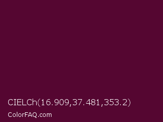 CIELCh 16.909,37.481,353.2 Color is a very dark magenta color and the nearest color is Mulberry Wood #5c0536. Hex code #550631 and RGB value is rgb(85,6,49). In RGB color space, this color is composed of 33% red, 2% green, 19% blue, In CMYK color space, this color is composed of 0% cyan, 93% magenta, 42% yellow , 67% black , In HSL color space, this color has a hue angle of 327° , 87% saturation and 18% lightness.
