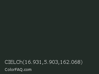 CIELCh 16.931,5.903,162.068 Color is a very dark green color and the nearest color is Charleston Green #232b2b. Hex code #222c27 and RGB value is rgb(34,44,39). In RGB color space, this color is composed of 13% red, 17% green, 15% blue, In CMYK color space, this color is composed of 23% cyan, 0% magenta, 11% yellow , 83% black , In HSL color space, this color has a hue angle of 150° , 13% saturation and 15% lightness.