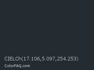 CIELCh 17.106,5.097,254.253 Color is a very dark blue color and the nearest color is Charleston Green #232b2b. Hex code #242b31 and RGB value is rgb(36,43,49). In RGB color space, this color is composed of 14% red, 17% green, 19% blue, In CMYK color space, this color is composed of 27% cyan, 12% magenta, 0% yellow , 81% black , In HSL color space, this color has a hue angle of 208° , 15% saturation and 17% lightness.