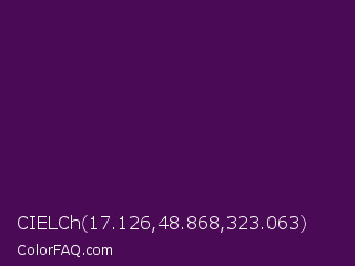 CIELCh 17.126,48.868,323.063 Color is a very dark purple color and the nearest color is Clairvoyant #480656. Hex code #4a0a55 and RGB value is rgb(74,10,85). In RGB color space, this color is composed of 29% red, 4% green, 33% blue, In CMYK color space, this color is composed of 13% cyan, 88% magenta, 0% yellow , 67% black , In HSL color space, this color has a hue angle of 291° , 79% saturation and 19% lightness.