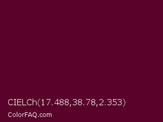 CIELCh 17.488,38.78,2.353 Color is a very dark rose color and the nearest color is Bordeaux #5c0120. Hex code #5a032a and RGB value is rgb(90,3,42). In RGB color space, this color is composed of 35% red, 1% green, 16% blue, In CMYK color space, this color is composed of 0% cyan, 97% magenta, 53% yellow , 65% black , In HSL color space, this color has a hue angle of 333° , 94% saturation and 18% lightness.