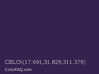 CIELCh 17.691,31.829,311.379 Color is a very dark violet color and the nearest color is Deep Grape #381a51. Hex code #37214e and RGB value is rgb(55,33,78). In RGB color space, this color is composed of 22% red, 13% green, 31% blue, In CMYK color space, this color is composed of 29% cyan, 58% magenta, 0% yellow , 69% black , In HSL color space, this color has a hue angle of 269° , 41% saturation and 22% lightness.