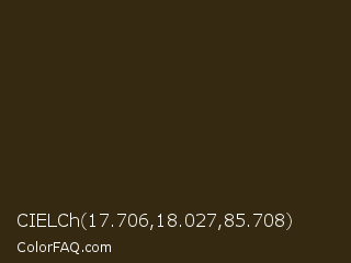 CIELCh 17.706,18.027,85.708 Color is a very dark orange color and the nearest color is Brown Tumbleweed #37290e. Hex code #352a11 and RGB value is rgb(53,42,17). In RGB color space, this color is composed of 21% red, 16% green, 7% blue, In CMYK color space, this color is composed of 0% cyan, 21% magenta, 68% yellow , 79% black , In HSL color space, this color has a hue angle of 42° , 51% saturation and 14% lightness.