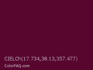 CIELCh 17.734,38.13,357.477 Color is a very dark rose color and the nearest color is Mulberry Wood #5c0536. Hex code #59062f and RGB value is rgb(89,6,47). In RGB color space, this color is composed of 35% red, 2% green, 18% blue, In CMYK color space, this color is composed of 0% cyan, 93% magenta, 47% yellow , 65% black , In HSL color space, this color has a hue angle of 330° , 87% saturation and 19% lightness.