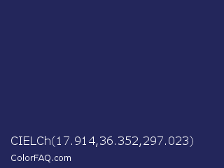 CIELCh 17.914,36.352,297.023 Color is a dark blue color and the nearest color is Cloud Burst #202e54. Hex code #23265b and RGB value is rgb(35,38,91). In RGB color space, this color is composed of 14% red, 15% green, 36% blue, In CMYK color space, this color is composed of 62% cyan, 58% magenta, 0% yellow , 64% black , In HSL color space, this color has a hue angle of 237° , 44% saturation and 25% lightness.
