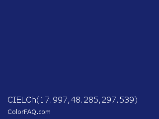 CIELCh 17.997,48.285,297.539 Color is a dark blue color and the nearest color is Lucky Point #1a1a68. Hex code #18246b and RGB value is rgb(24,36,107). In RGB color space, this color is composed of 9% red, 14% green, 42% blue, In CMYK color space, this color is composed of 78% cyan, 66% magenta, 0% yellow , 58% black , In HSL color space, this color has a hue angle of 231° , 63% saturation and 26% lightness.