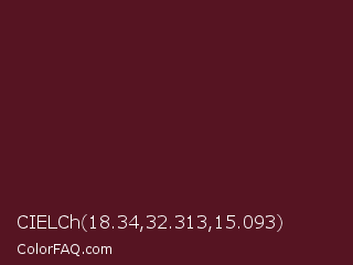 CIELCh 18.34,32.313,15.093 Color is a very dark red color and the nearest color is Maroon Oak #520c17. Hex code #561422 and RGB value is rgb(86,20,34). In RGB color space, this color is composed of 34% red, 8% green, 13% blue, In CMYK color space, this color is composed of 0% cyan, 77% magenta, 60% yellow , 66% black , In HSL color space, this color has a hue angle of 347° , 62% saturation and 21% lightness.