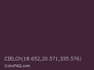 CIELCh 18.652,20.571,335.576 Color is a very dark magenta color and the nearest color is Livid Brown #4d282e. Hex code #42233a and RGB value is rgb(66,35,58). In RGB color space, this color is composed of 26% red, 14% green, 23% blue, In CMYK color space, this color is composed of 0% cyan, 47% magenta, 12% yellow , 74% black , In HSL color space, this color has a hue angle of 315° , 31% saturation and 20% lightness.
