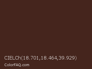 CIELCh 18.701,18.464,39.929 Color is a very dark red color and the nearest color is Cork #40291d. Hex code #45251d and RGB value is rgb(69,37,29). In RGB color space, this color is composed of 27% red, 15% green, 11% blue, In CMYK color space, this color is composed of 0% cyan, 46% magenta, 58% yellow , 73% black , In HSL color space, this color has a hue angle of 12° , 41% saturation and 19% lightness.